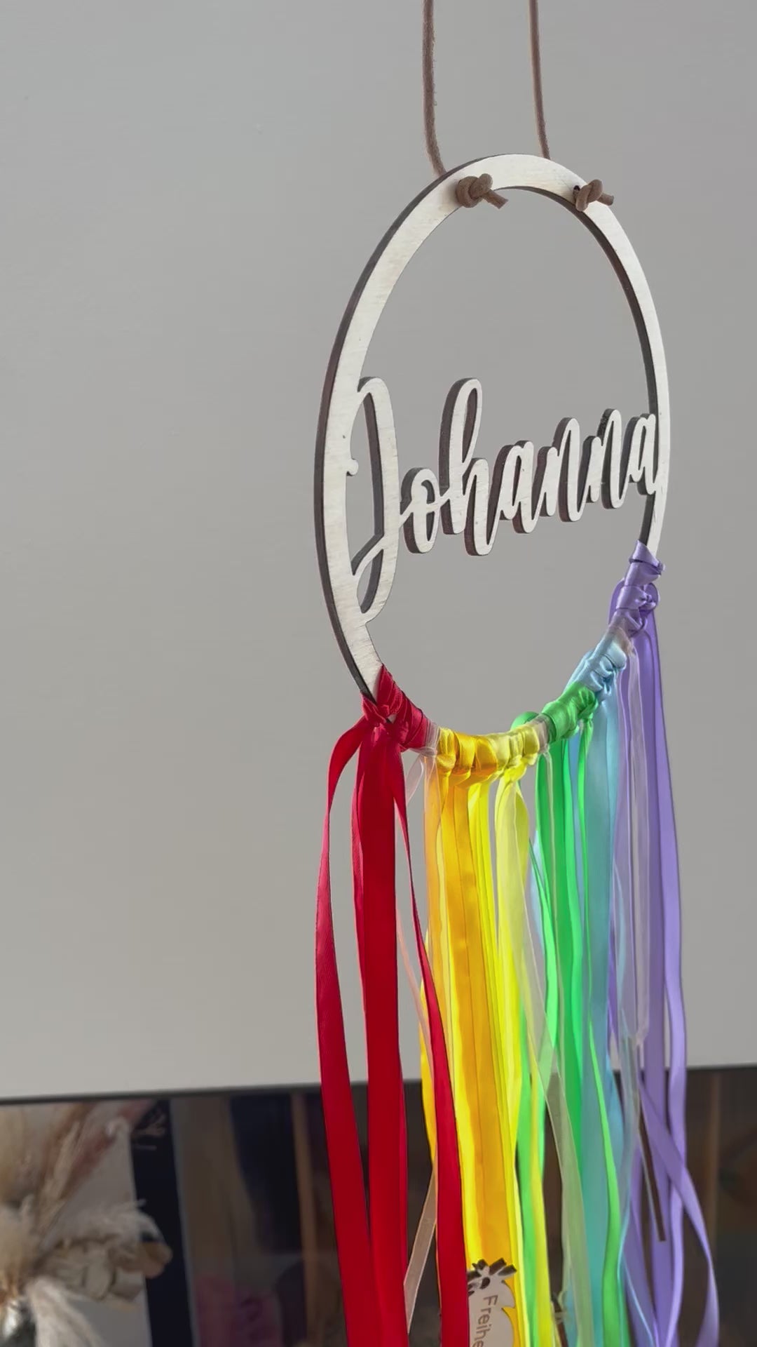 Appeso: 3 piume di legno personalizzabili + nastri